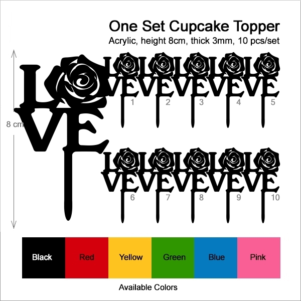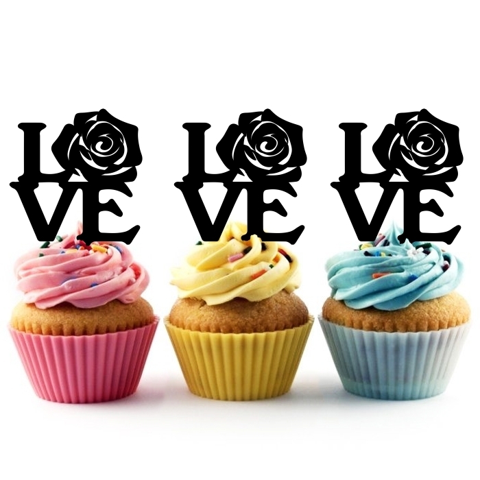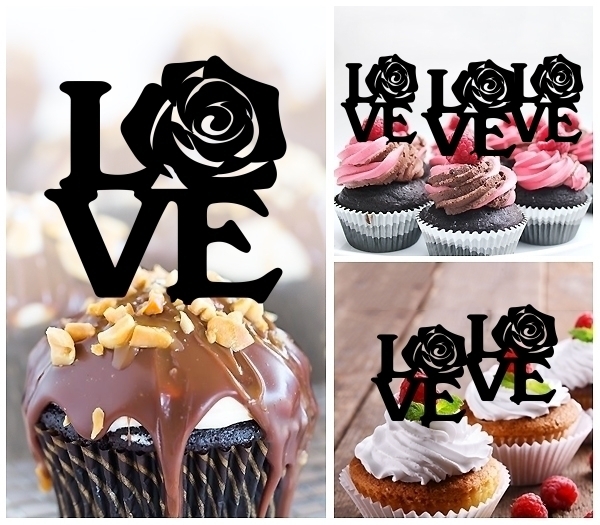 Love Rose Flower Cupcake 10 Toppers Laser Cut Acrylic for Wedding Birthday Baby Shower Bachelorette Engagement Party Decor